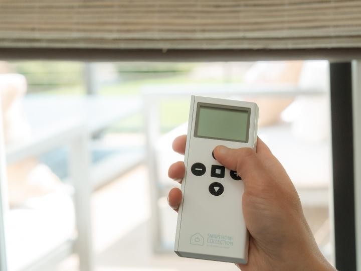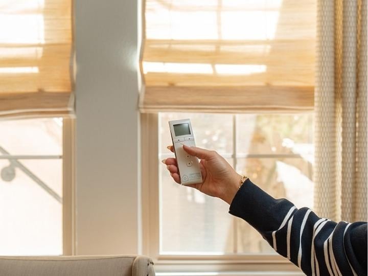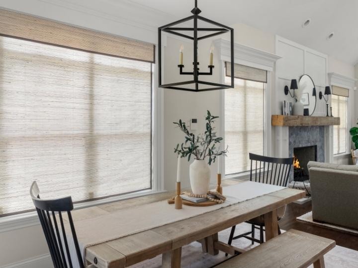 Modern convenience at your fingertips – motorized woven wood shades offer sleek style and effortless control.